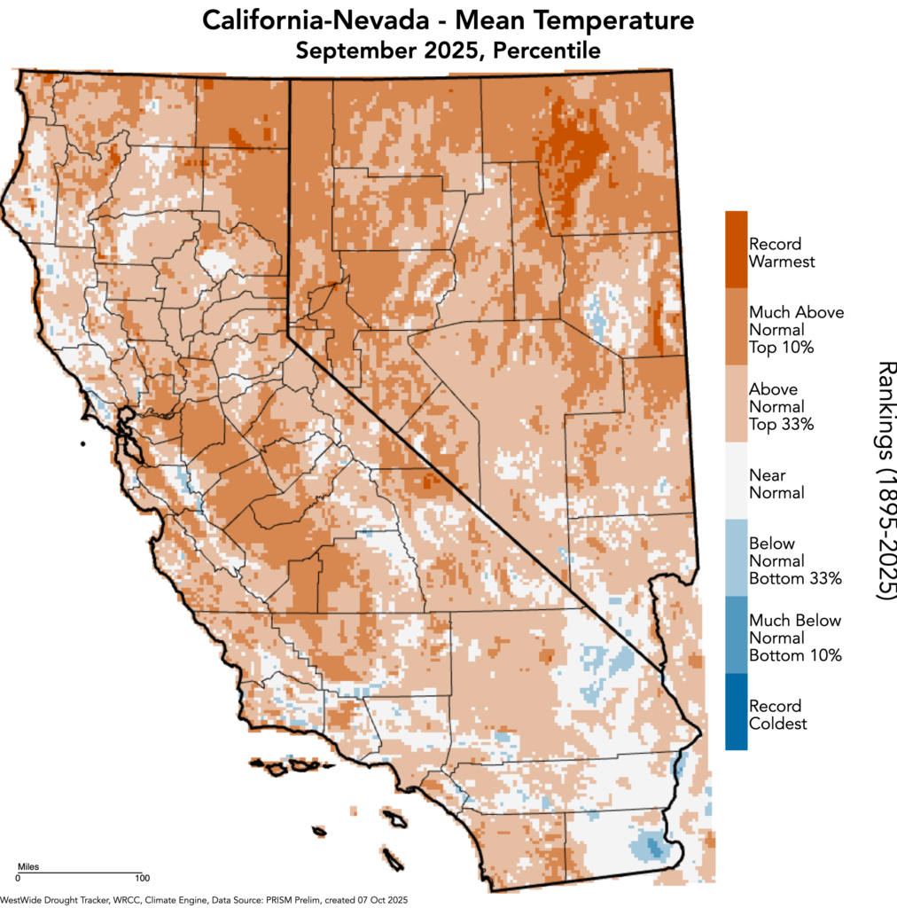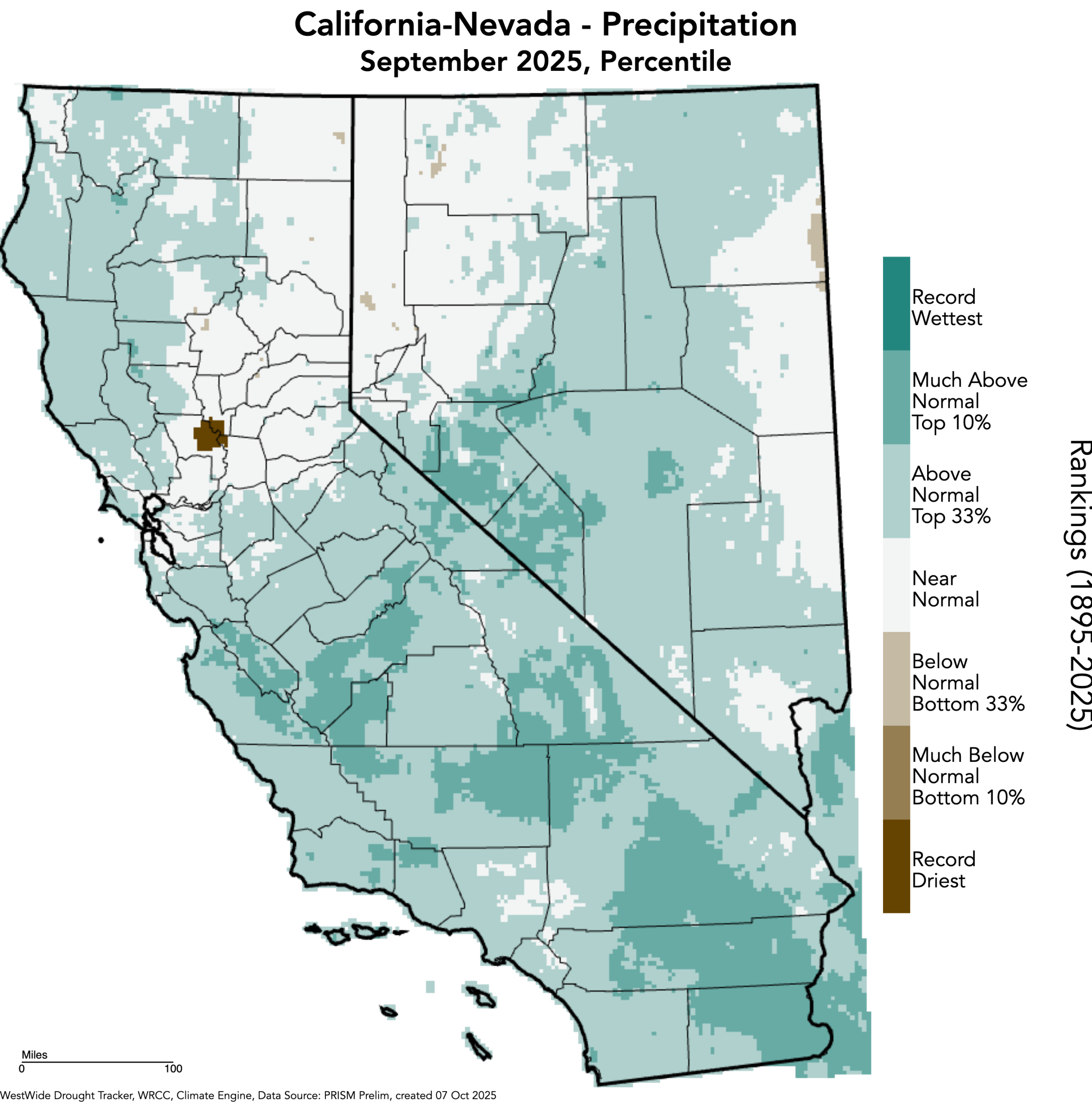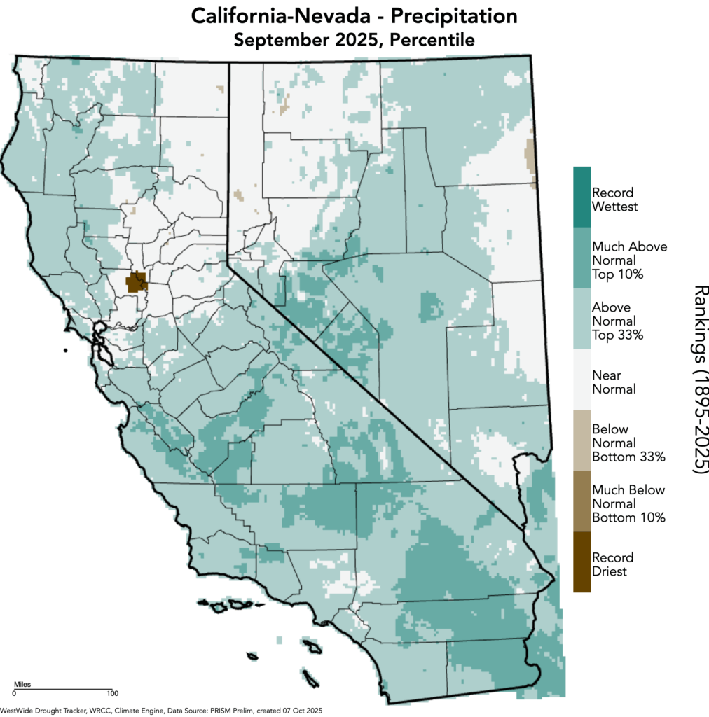 September 2025 was yet another “strange” weather month along the Pacific Coast. In California, multiple episodes of precipitation (and a fair bit of thunderstorm activity) brought wetter conditions to much of the state–particularly across central and southern California. Serious, even deadly flash flooding and debris flows occurred in the lower deserts of SE CA and the San Bernardino Mountains when remnant moisture and instability from Tropical Storm Mario produced locally torrential thunderstorm downpours; while rain elsewhere was (thankfully) much less dramatic, it was nonetheless unusual for September.