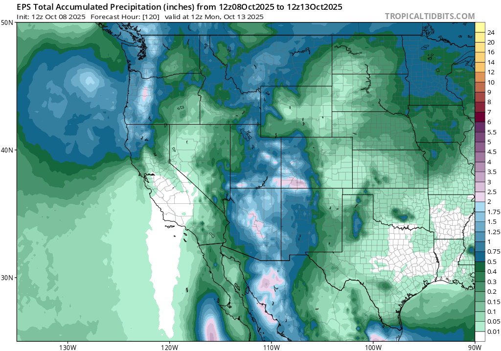 As noted, there is inherently high uncertainty during episodes like this involving injection of energy and moisture by recurving typhoons during autumn. The forecast could yet shift in a drier (or perhaps even wetter!) direction; at the moment, the ECMWF ensemble is much wetter than the GFS ensemble (for instance). However, the odds of what could be a “fire season ending” rain for most of NorCal, and perhaps parts of central CA, appear to be rising (though still remain low for SoCal). So this could ultimately be a helpfully timed low pressure system from a fire weather perspective.