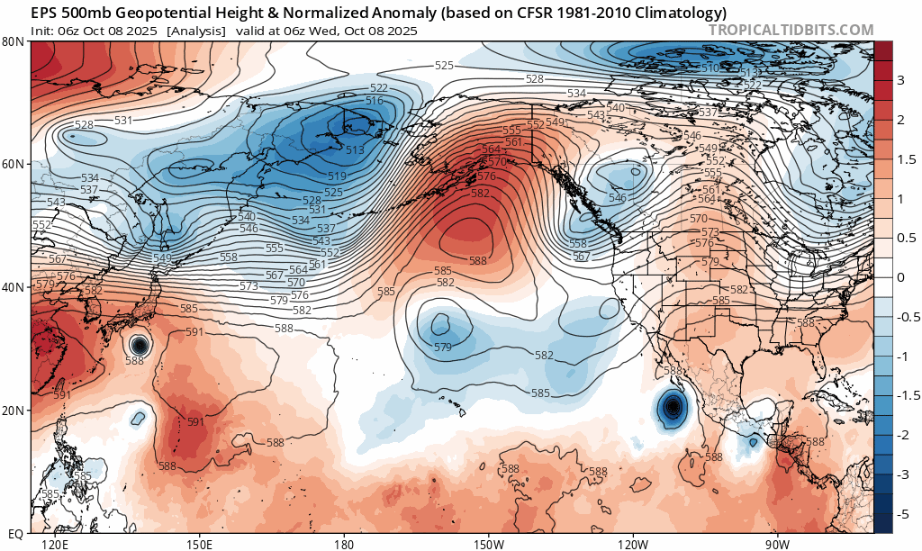 Altogether, this paints a picture of a North Pacific basin in which the north-to-south (meridional) temperature differential is among the weakest it has ever been in the modern record. In practice, the meridional SST gradient can influence the strength and position of the jet stream, with a weaker and northward-shifted gradient perhaps increasing the likelihood of a weaker than average and northward-shifted jet. However, these anomalously warm waters (for as long as they persist) will also allow for increased evaporation from the ocean surface and therefore probably increase the amount of water vapor in the lower atmosphere available for winter storms/atmospheric rivers to take advantage of if/when they occur. I think we’ve already been seeing the effects of this with the early-season systems this autumn, which have appeared to generate deep convective (i.e., thunderstorm) activity with relative ease (perhaps due to increased lower atmospheric instability). Thus, at least for the rest of fall and early winter, we will experience the effects of a North Pacific SST configuration that has rarely–if ever–been recorded: extremely warm extratropics across nearly the entire basin combined with cooler-than-average tropical waters.