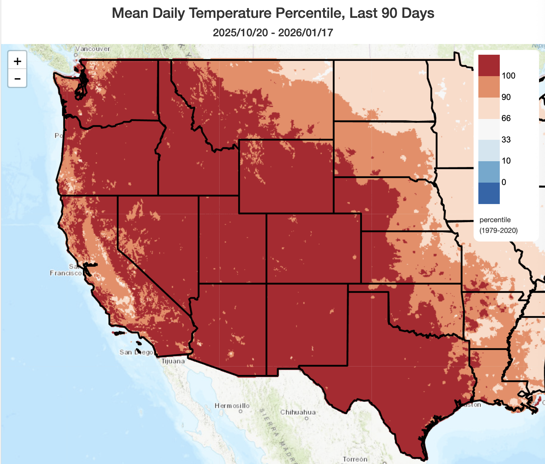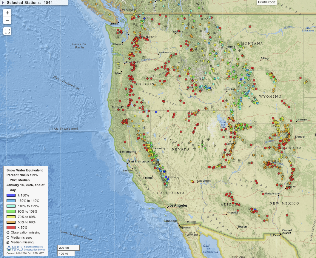 Snowpack conditions are, accordingly, terrible across most of the West, as a result; in fact, as of this writing, every single Western state has at least one snow water reporting site logging record low values for mid-January. Except for the Northern Rockies and Southern Sierra, where heavy precipitation in high elevation basins has outweighed the effects of record warmth, snowpack is far below average levels for the time of year and in fact is at singular record lows in numerous locations (most concentrated in Utah and Colorado, but widespread elsewhere and especially at lower elevations).