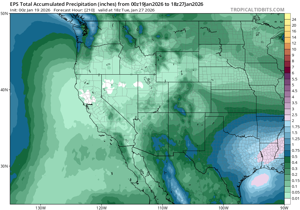 Mostly warm and dry across California next 10 days (except scattered SoCal showers later this week); possible late Jan pattern change, but with high uncertainty (and it would be wet and *warm*)