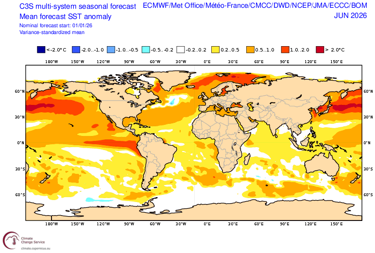 All signs appear to be pointing toward the rapid development of El Niño conditions in the tropical Pacific by spring or early summer. In fact, the latest “superensemble” blend update from last week suggests very high confidence in this outcome, with a slight chance of rather strong El Niño conditions in place already by June. This is a very aggressive forecast–unusually so far so early in winter. And it is supported by recent observational trends, with multiple persistent/strong westerly wind bursts now ongoing in the tropical western Pacific and a substantial oceanic subsurface warm water mass moving eastward. I’ll be watching this closely in the coming weeks, as this could begin to affect California and western weather as soon as April or May.