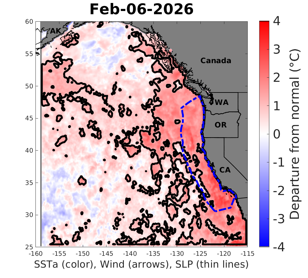 The most obvious effect, of course, is warmer near-shore temperatures in coastal areas (I felt this personally last week right along the beaches in LA County, where air temperatures were in the 80s with essentially no on or offshore wind at all). That anomalous warmth will also be “dragged inland” to a limited extent, both during dry periods with onshore flow and also when Pacific storms push air inland. It may cause snow levels to be a bit higher than some models suggest during precipitation, at least prior to or during cold frontal passages (more northerly winds behind cold fronts might negate this effect).
