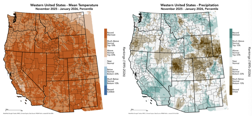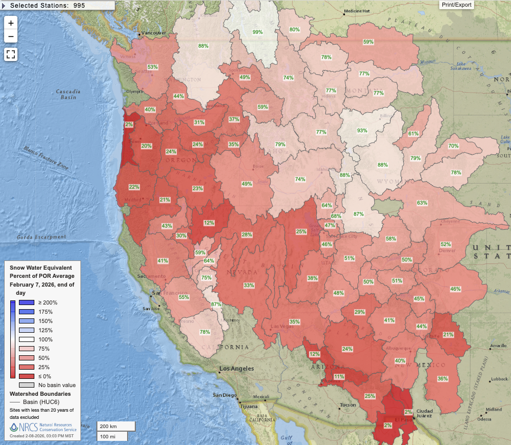 Record warm winter-to-date continues across most of the American West; already abysmal mountain snowpack dips to record low levels in many areas (except…higher elevations in southern Sierra!)