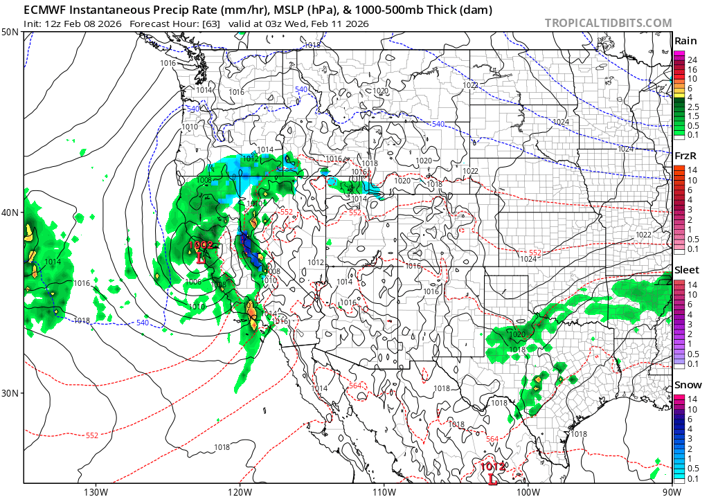 Following the Tuesday system, there is a fairly high likelihood off additional and possibly larger/stronger storms thereafter along the West Coast and across the interior West. The persistent ridge will be replaced, for at least a 7-10 day period, by a quasi-stationary trough along the West Coast or just offshore–a favorable setup for recurring precipitation events. This is a fairly high-energy pattern, with a strong zonal Pacific jet likely to be draped across California for much of the period. That makes pinning down individual storms difficult to impossible at this time horizon, but the overall pattern is one that may support 1-2 strong low pressure systems/associated cold frontal passages, with the possibility of widespread moderate to heavy rain and more localized strong/gusty winds (as well as period of heavy mountain snowfall, and possibly some coastal thunderstorms. More on that below.).