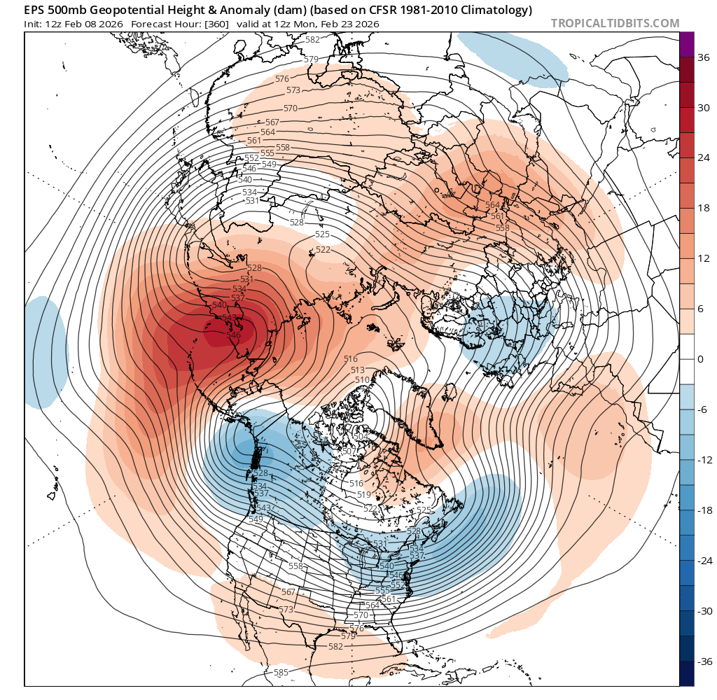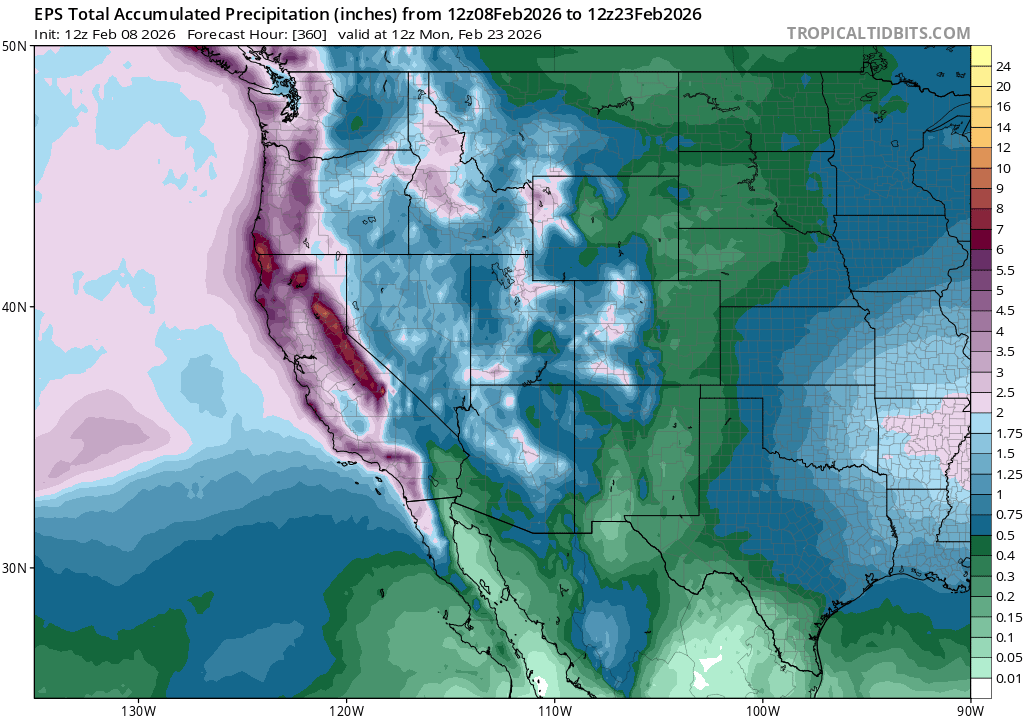 Following this 1-2 week and mostly beneficial storm cycle, there’s a wide range of possibilities regarding what happens next. There are some suggestions of another major polar vortex disruption, which may result in another wavy/amplified jet pattern over the Northern Hemisphere. But even if that happens, there’s no guarantee that the subsequent persistent ridges and troughs will set up in the same positions they did in January. In fact, right now, the ensembles are hinting at the potential for a very strong and persistent blocking ridge developing over the North-Central Pacific near the Aleutian Islands or Bering Sea. If that happens, a large cold air mass will likely develop once again over western Canada. Where will it go thereafter? Well, it all depends on the broader hemispheric pattern. This could mean a re-load of the warm West/cool East pattern once again, or it could even allow some late-season Arctic air to spill southward across portion of the U.S. West. That latter outcome does seem decidedly less likely than the former, but I’ll be keeping an eye on it!