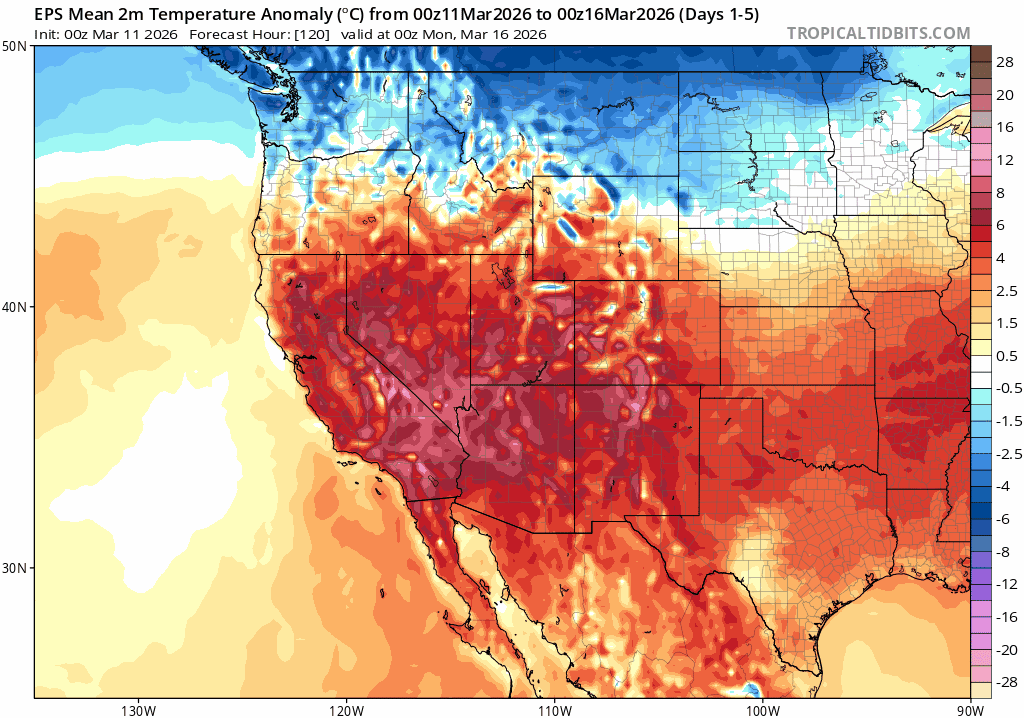 Still, this is very likely to become a historic heat event for the time of year. The heat will certainly be record-breaking, and perhaps in some locations record-shattering (i.e., it will break existing records by wide and statistically remarkable margins). Nearly every observing site in most Western U.S. states will break daily records; some for 7-10 days consecutively. Many locations will also break all-time monthly March temperature records (quite a feat during the first half of the month), as well as all-time records for “earliest 80/90/100/even 110F temperature.” Believe it or not, some desert locations may even see temperatures that approach or exceed *April* records–and again, I emphasize, we are still in the first half of March! Other meteorological commentators have already opined that they haven’t ever seen a March heat event like the one currently expected to unfold this month, and I generally agree with that assessment. The combination of projected intensity, duration, and spatial extent of this event are all individually remarkable–and, together, make the predicted event overall truly extraordinary.