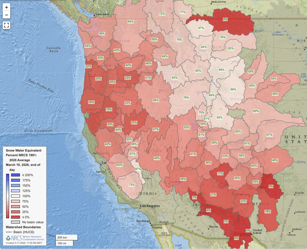 No March Miracle: Mountain snowpack, already very low, may reach unprecedented levels following historic heat, with major water/wildfire implications for spring/summer to come.