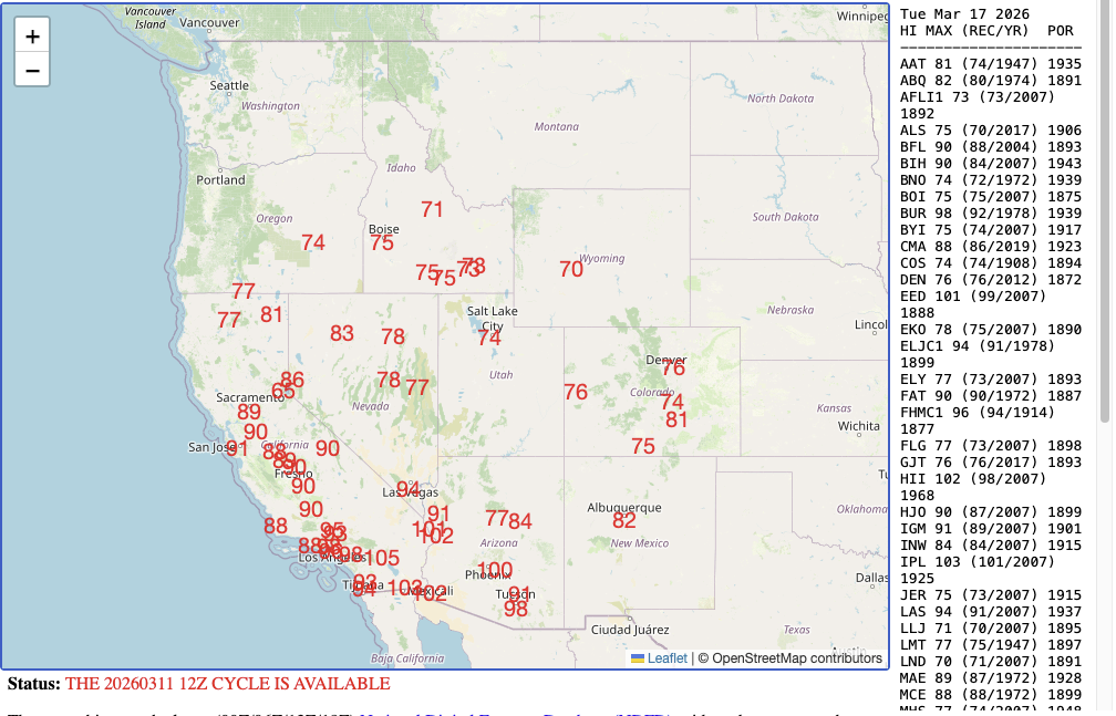 Some especially remarkable numbers: Parts of the Los Angeles basin could approach 100F Thu and Fri this week, with even higher temperatures possible again by the middle of next week. The lower deserts of southeastern California and southern Arizona will certainly exceed 100F, and possibly 110F–which would be (by far) the earliest in the calendar year such extreme temperatures have ever been observed in this region. Parts of the SF Bay Area and the entire Sacramento Valley could see temperatures approach or even exceed 90F locally; the Colorado Front Range (including Denver–the “Mile High City”–will likely get well into the 80s). I will repeat, once more for emphasis, that we are still in the first half of March.