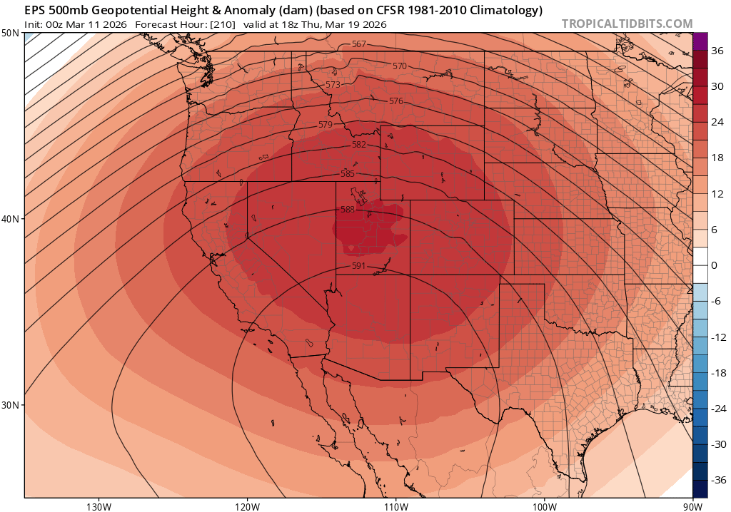 I do genuinely wish I had better news to share, but…well, the next 10-14 days look truly exceptional across the Western U.S., and not in a good way. A widespread, prolonged, and exceptionally intense March heatwave will begin by Thursday, peaking first on Friday (across Southern California) and then again in even more intense and widespread fashion (stretching from clear from San Francisco to Phoenix to Denver) by the middle of next week. In fact: the strongest mid-tropospheric ridge ever observed in the southwestern U.S. is expected to develop by Friday, and then will probably go on break that new record (set this week) when it re-organizes into an even broader and stronger ridge next week.